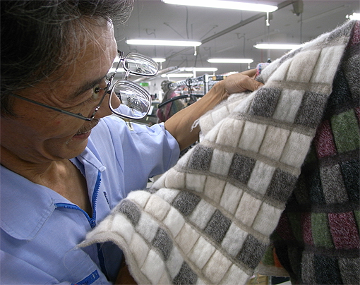 (写真は、カシミアのテキスタイルの風合いを見る、編立て職人。MASAKIとKYOKOの難易度の高い要求にも、粘り強く答えてくれる。