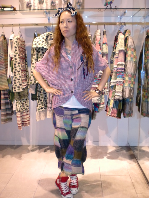 飯塚様のコーディネートは、新作のM.のカーディガンとブロック柄のパンツを合わせて