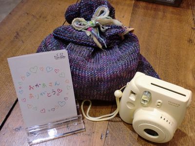 右にあります簡単カメラ「チェキ」でメッセージカードにご自身のお写真をお入れして、
