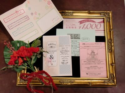 お母様とご一緒にお試し頂けるお化粧品の無料お試しチケットや、施術でお使い頂ける1,000円券も配布しております!!
