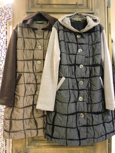 <左>ドット大柄布帛×ウール中綿コート¥65,100 <右>袋織り変形格子柄フードコート¥61,950