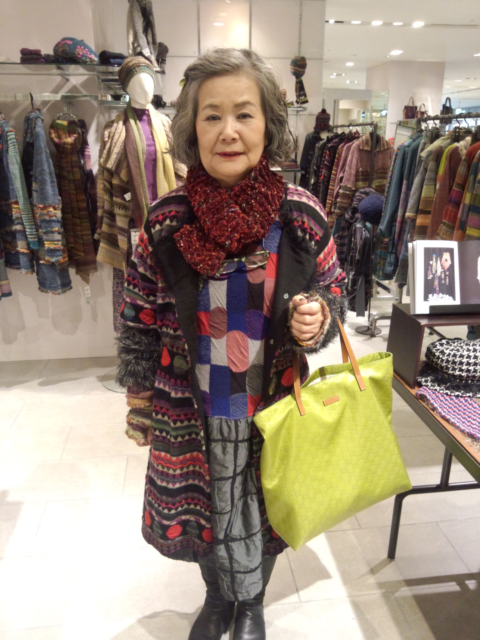 また、赤のマフラーもご自宅で作られたそうです。本日のコーディネートにとてもマッチしております!