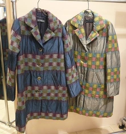 そしてコート!こちらも中綿入り膝丈。光沢感のある素材にニットが膜のように織り込まれています。素材感を楽しんで頂けます。