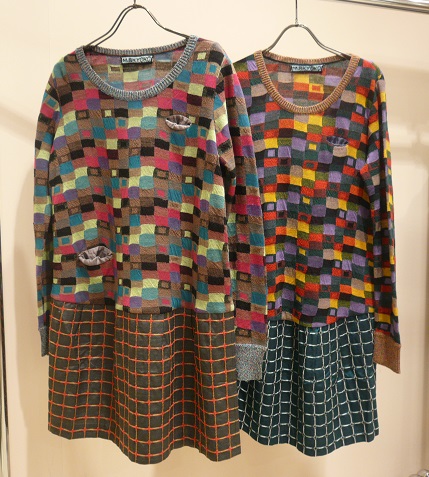 こちらはワンピース。異素材とのコンビが大胆なミニマム柄。