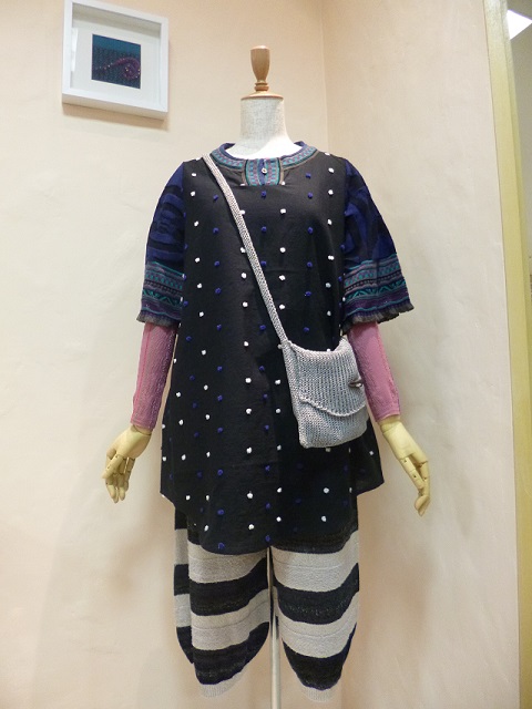 幾何学柄のニットのお袖は、ゆったりめで重ね着にもおススメです。