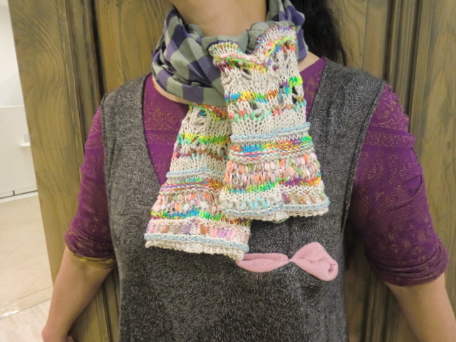 首に巻いたり、袖に通したりと、