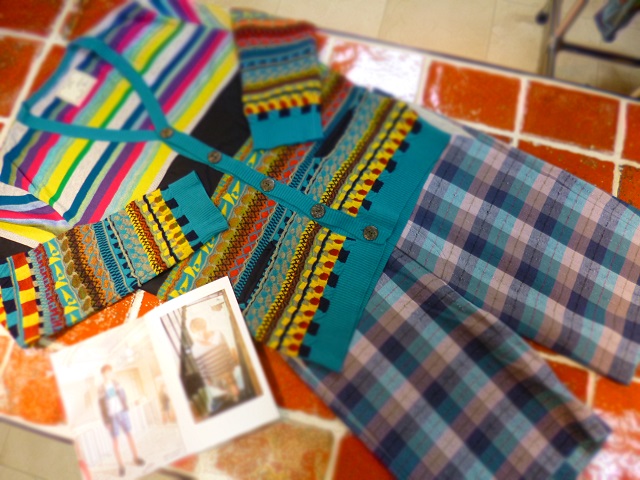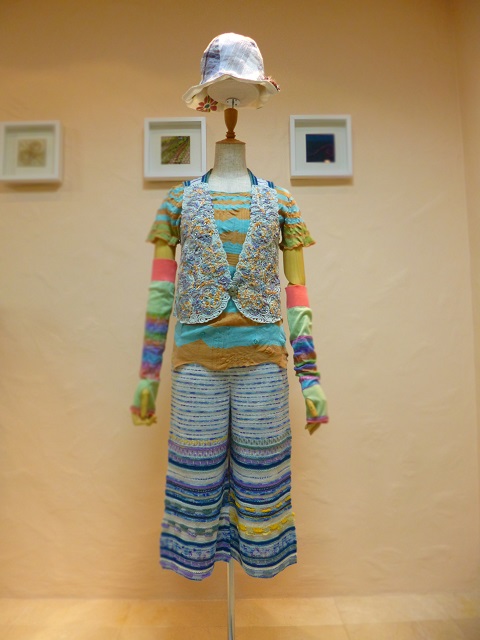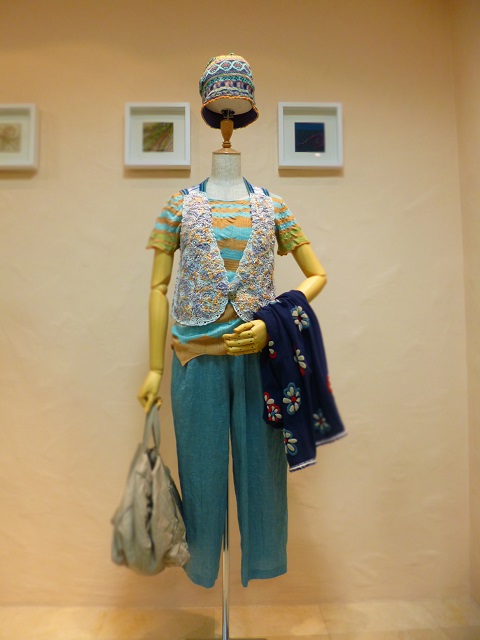 左写真のニットパンツは皺にならず、旅行にぴったりのアイテムです。同じシリーズの刺繍入りベストと合わせてもステキです。