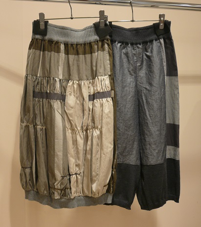 光沢感のある素材。スカートはイレギュラーに入るシャーリングがカワイイです。パンツは裾がニット。