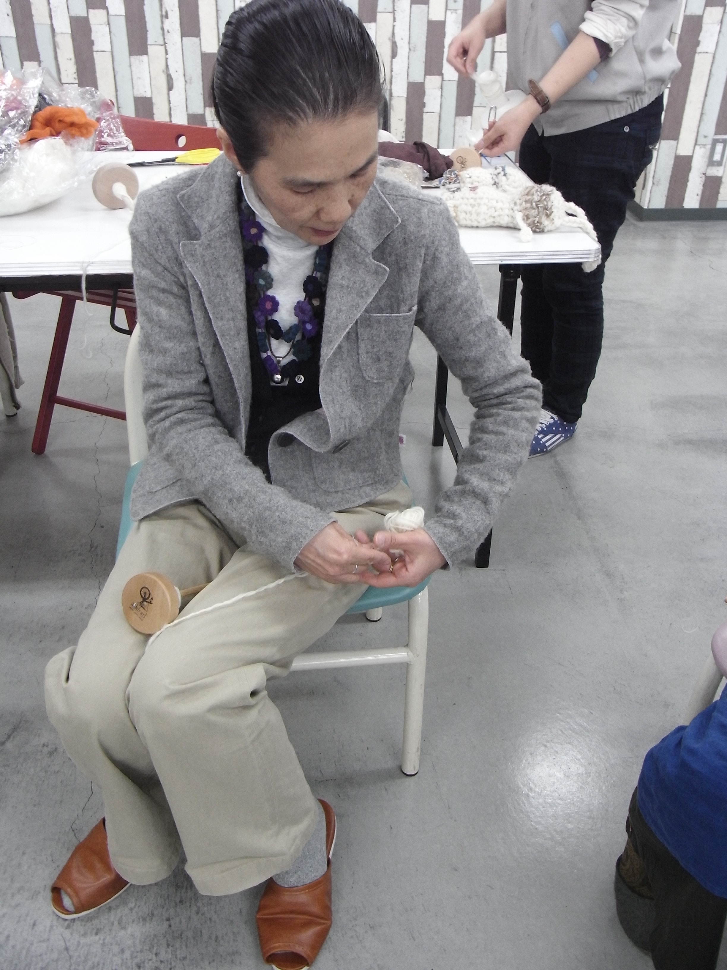 スピンドル(駒)を使って紡ぐ糸の実演会を先生をお招きして行ないます。