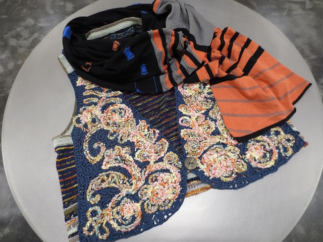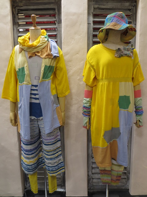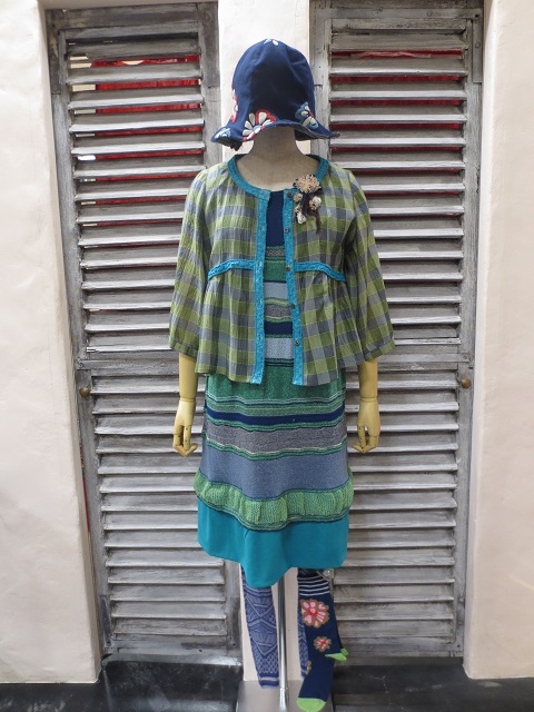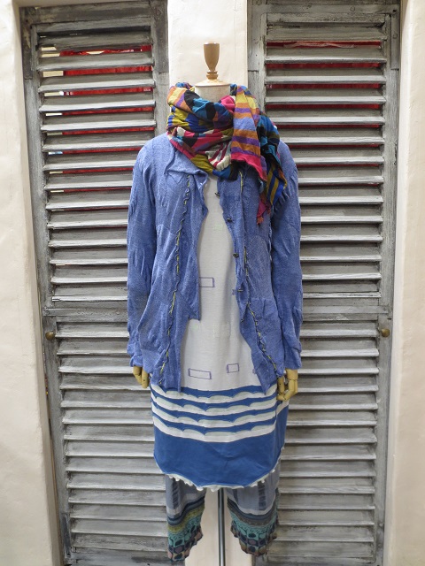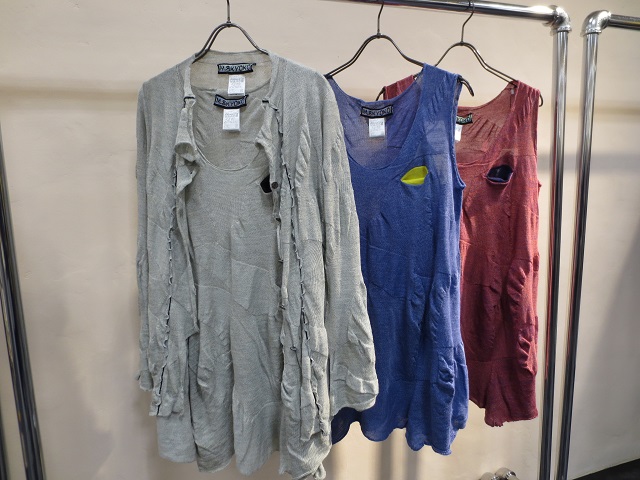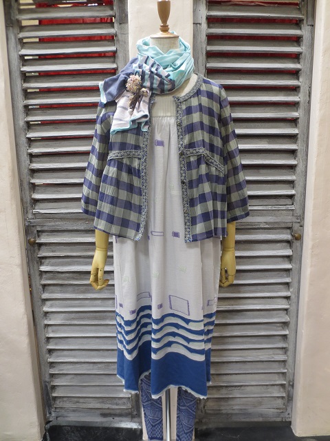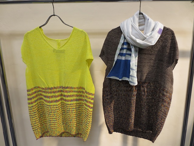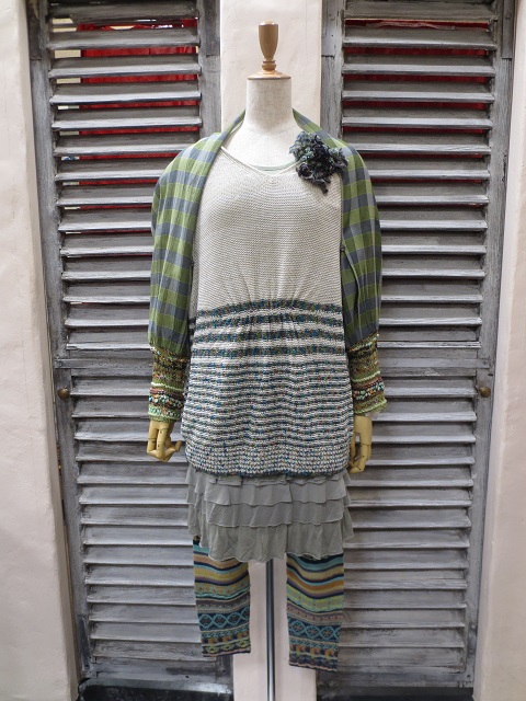 部分的にストレッチ糸でアクセントを効かせたカーディガン&ワンピースは、柔らかいコットン素材。M.&KYOKOらしいインターシャニットです。涼しげなミドルゲージのパンツがリゾート気分を盛り上げてくれますネ。