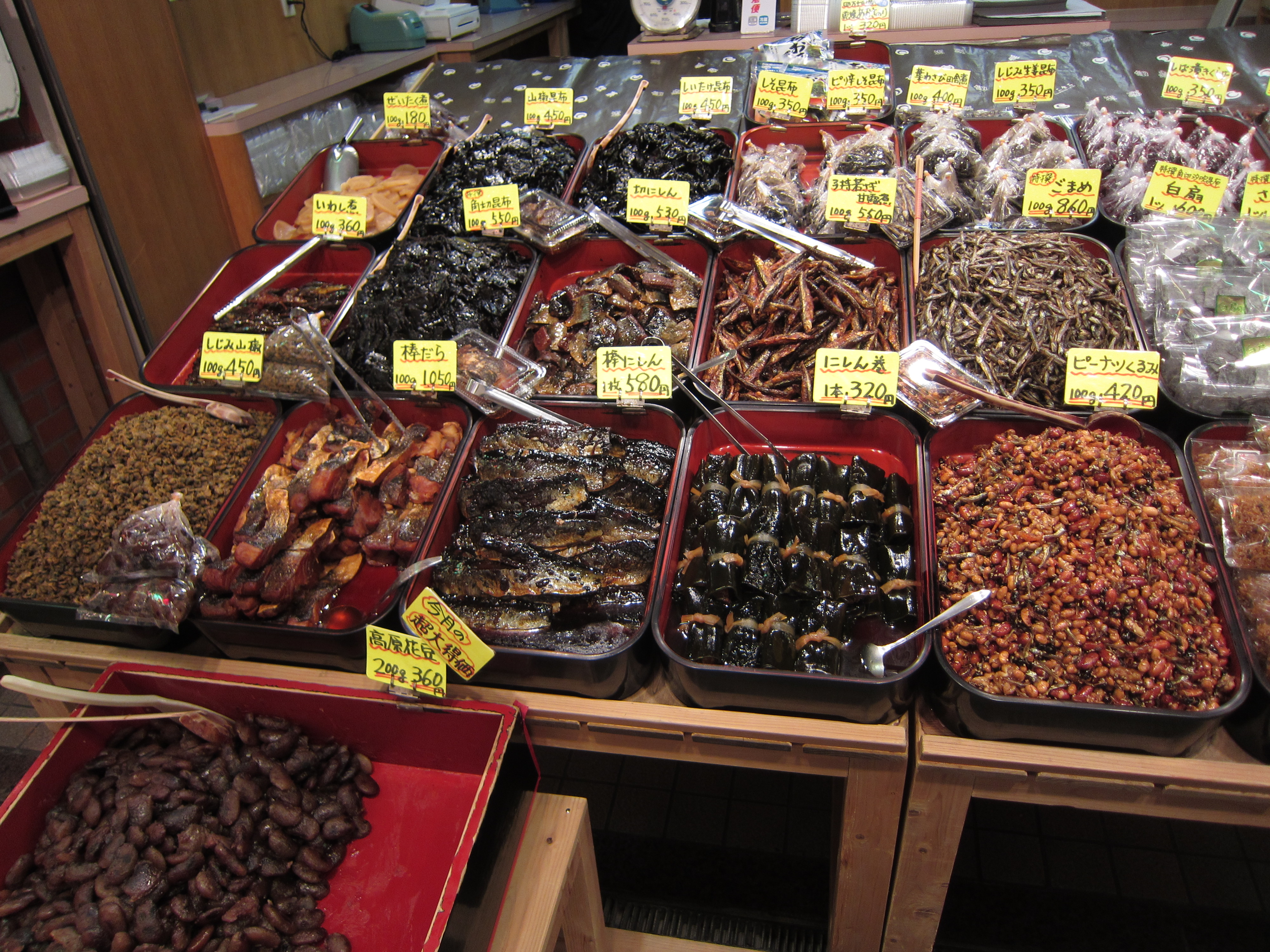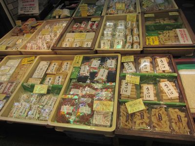漬物、豆、お菓子、お茶、ねり物、てんぷら、