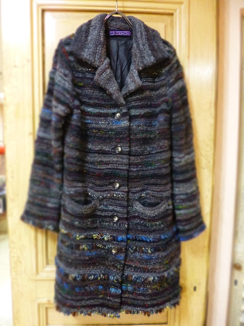 手編み風のざっくりした 光沢のあるドット柄に衿が 細いモヘアと太いモールや