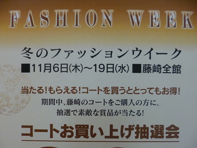 ただ今、藤崎全館で「冬のファッションウイーク」を開催中です! 期間中、Fカード利用でコートを買ってWプレゼント等、大変お得に なっています。
