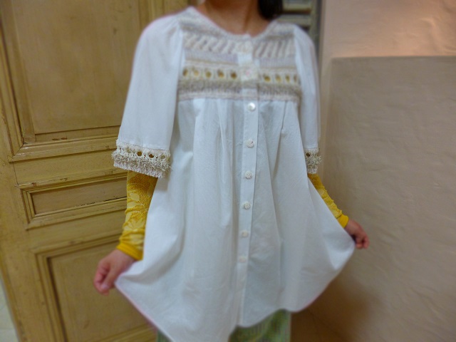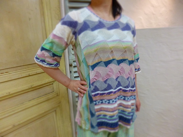 襟元や袖に、ホワイト、生成りなどのナチュラルカラーのヤーンが沢山織り込まれた、