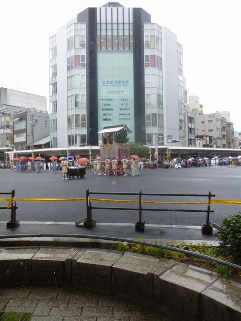 この日は台風の影響もあり大粒の雨の中、鉾の屋根まで人がのぼり、大勢の方々が綱を引き、観覧のお客様が見守る中で山鉾巡行は素晴らしく、迫力がありました。