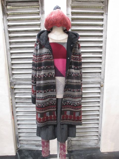 細かめの幾何学柄でコーディネートしやすいコートです。