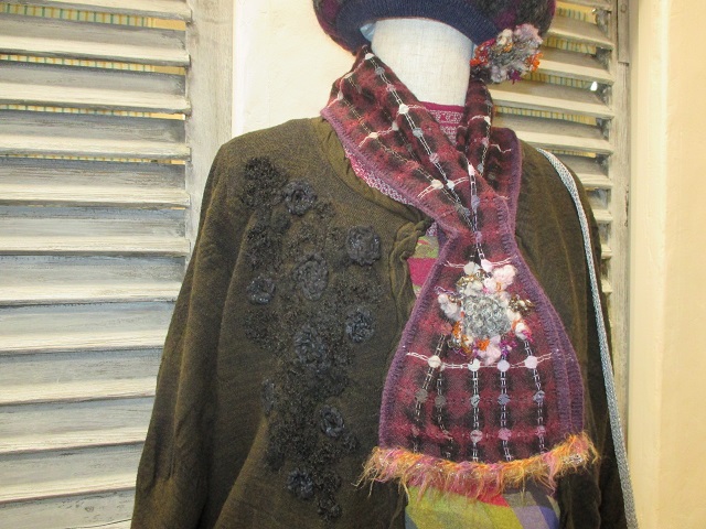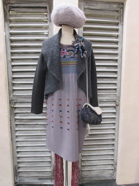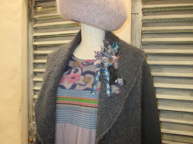 カーディガンの刺繍、小物のコサージュで華やかさをプラス♪