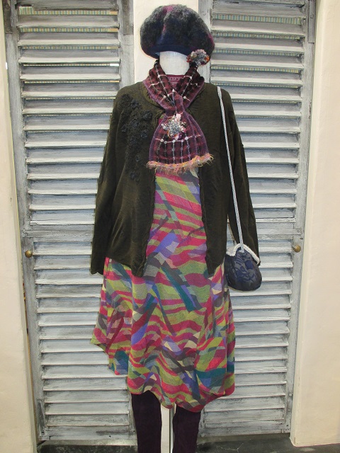 ビビットカラーのジャガード柄ワンピースが目を引き