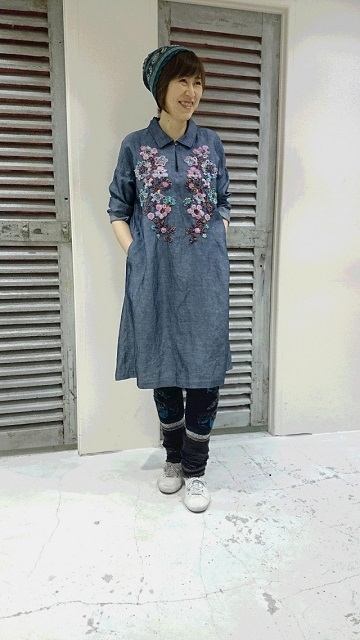 胸元のフラワー刺繍で春を先取り♪インディゴ染めのワンピース。