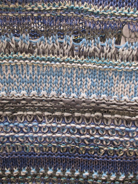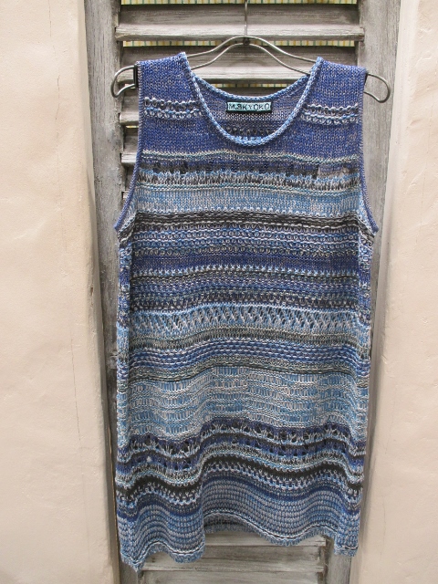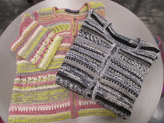 画像だけでは分かりづらいですが、リリヤーンテープを使用し、太さの違う糸や編み方に変化がある着ていて楽しくなるニットです!