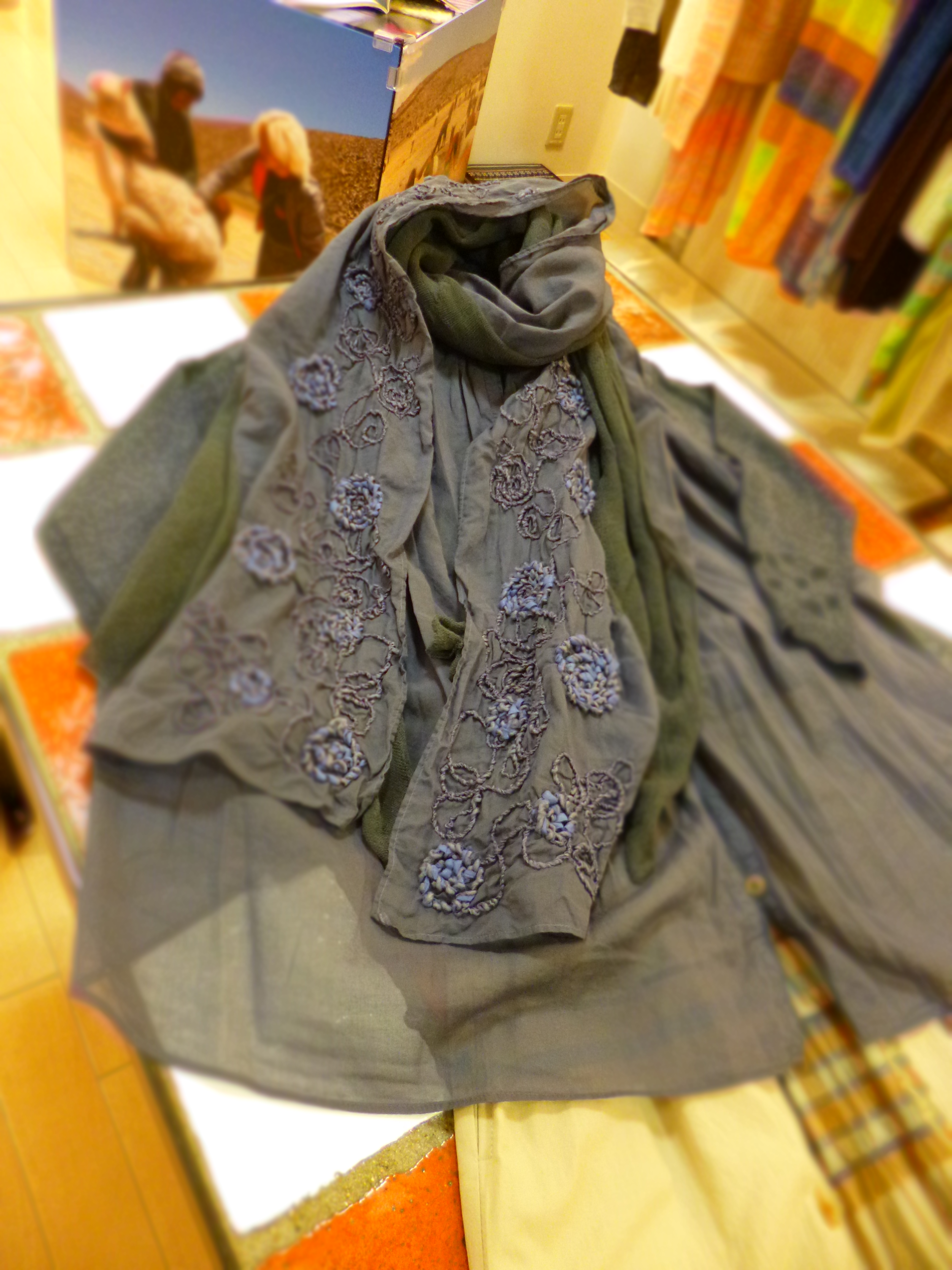 ふんわり柔らかなブラウスと和紙素材×刺繍のコンビが素敵なショール。