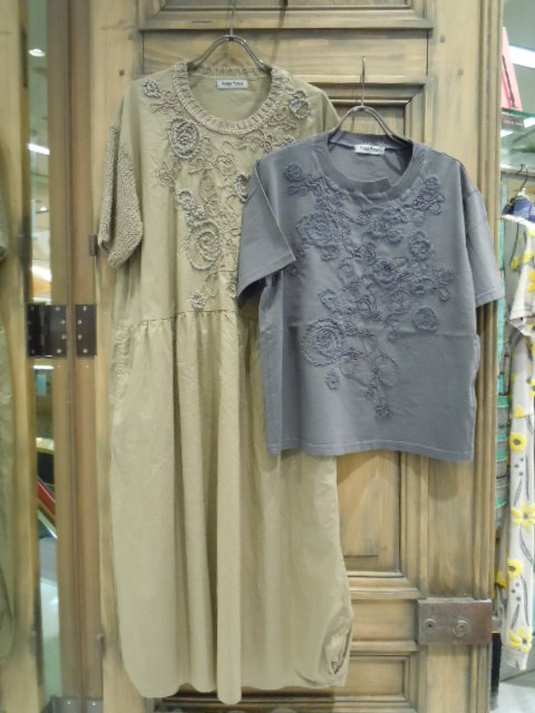 左:コットン刺繍ワンピース¥33,000+税 右:コットン刺繍Tシャツ¥23,000+税