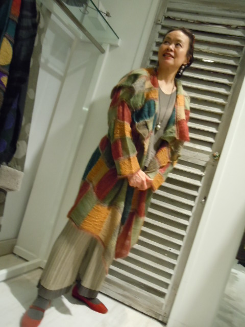 ロングカーディガンは毎年人気のモヘアブロック柄インターシャのふわふわの軽い仕上がりです。