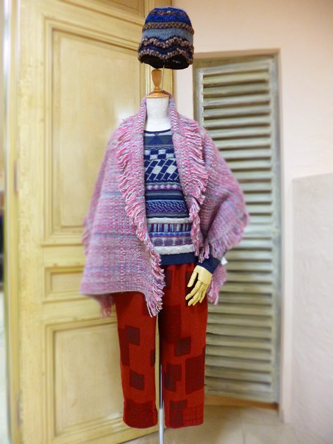 手織りツイードのようなざっくりとした厚手のストールを羽織り代わりに。