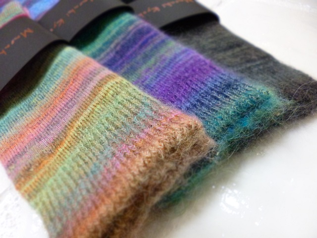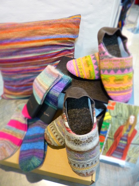 ウール素材の生地で作ったクッションカバーやエムアンドキョウコらしいニットで作ったバブーシュ。