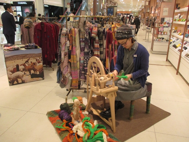糸車で、糸を紡ぐ実演を行い、みなさん興味深々でした。