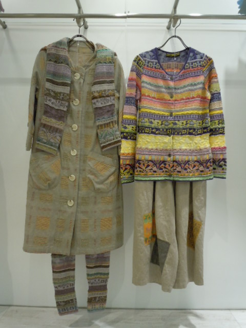 左のコートは。3色展開 同じ生地のパンツがとってもユニークかつ
