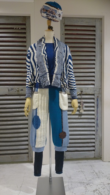 動きのあるボーダーのカーディガンと、 柄の切り替えがアクセントのパンツは