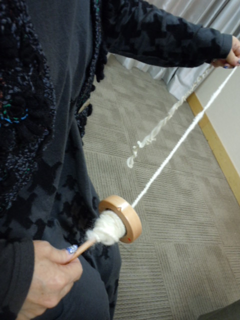 今回は、<スピンドル>という糸紡ぎ専用コマを使って羊毛に撚りをかけて糸を作る。