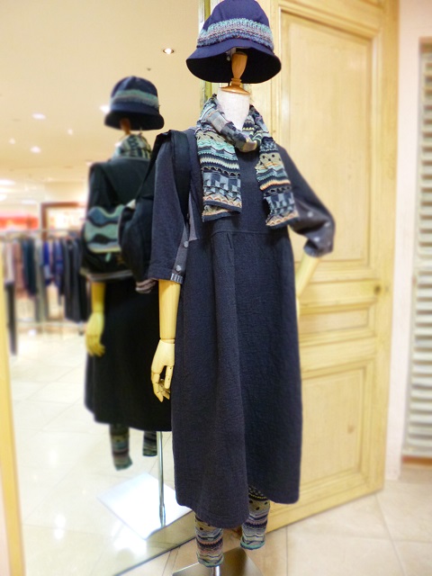 ワンピースもインナーを重ね、襟元にはストールでボリュームアップ。