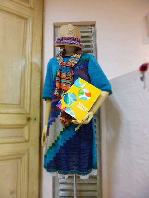 ターコイズカラーが眩しいワンピースにラフィアのお帽子。