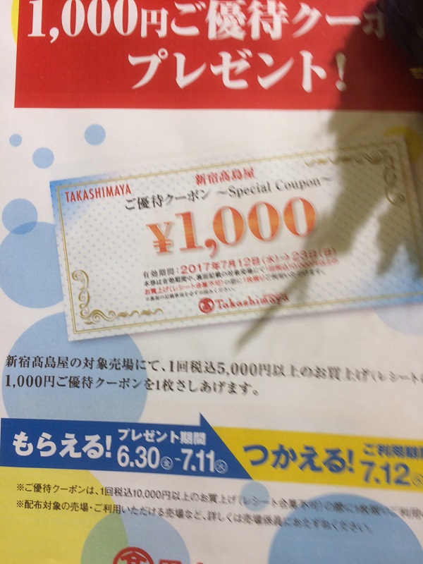 7月11日まで5000円以上お買上げで1000円のタカシマヤクーポン券 プレゼント。(7月12日ー23日まで使えます) ぜひ、おまちしております。 新宿タカシマヤ店 森永 安田 濱崎