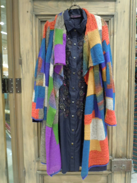 左: ネイビーのシャツドレスに羽織って (KAGA784W 53番色 ¥44.000-TAX抜き)