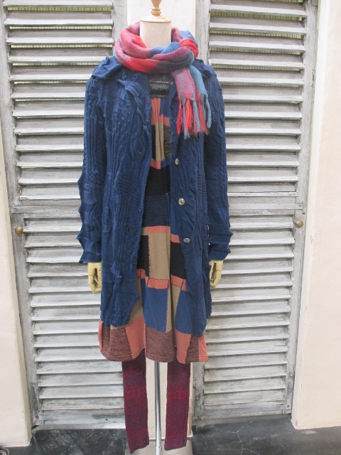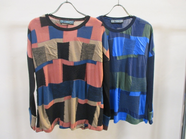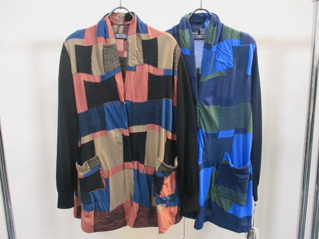 プルオーバーとカーディガンは少し肩がドロップしたデザインで、それぞれ袖部分が無地のニットを使用しています。