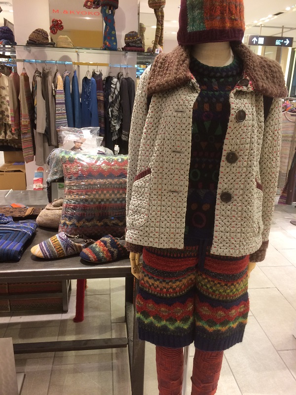 赤を中心にカラフルな配色、ストールと帽子がポイントです。