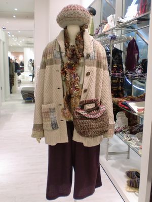 右:カーディガンの上に、同じ柄のストールを重ねて暖かさUP🌼