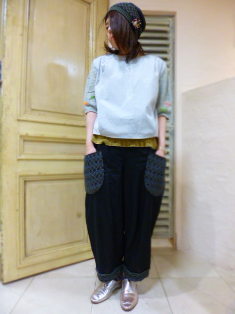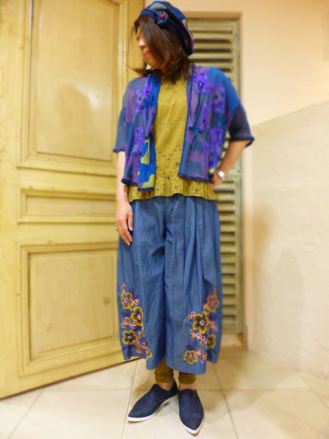 ダンガリー調のデニムに刺繍が入った八分丈のワイドパンツ。