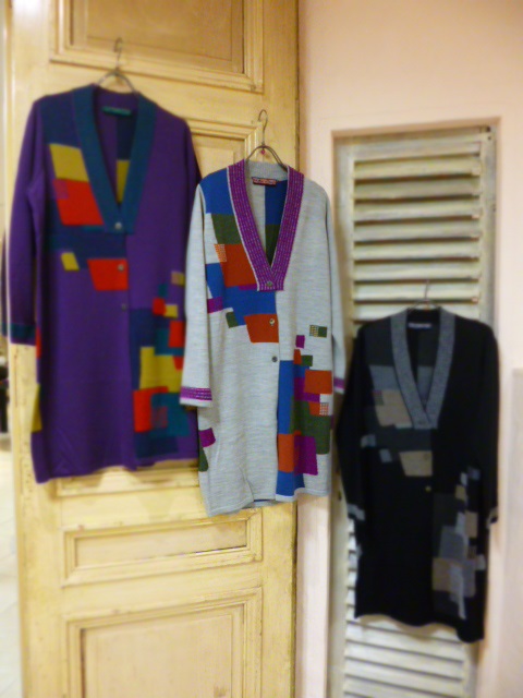 軽さのあるウールにランダムなブロック柄が印象的なカーディガン。