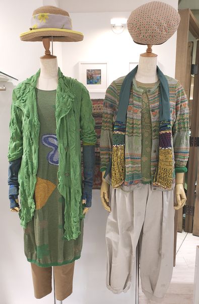 左:ラミー×コットンのシームレスカーディガンは、鮮やかな黄緑色が目を引きます♪