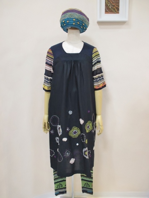 肩や袖部分がニットで出来ており布帛部分はコットン100%、刺繍が印象的なワンピース