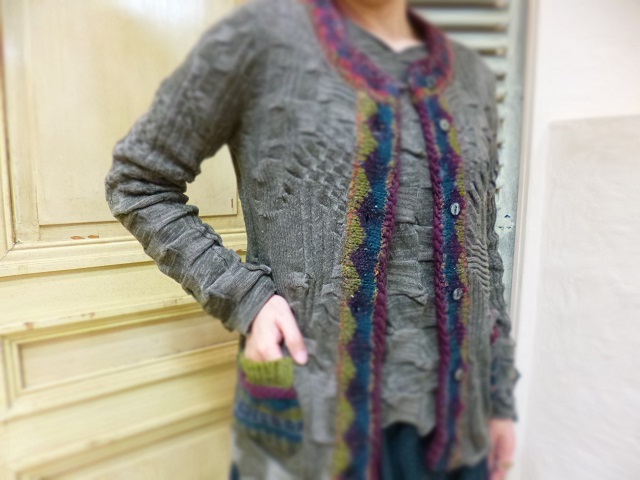 カーディガンはざっくりとした厚手の編地の縁取りとポケットがアクセントに!