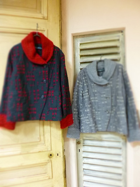 ウールのドットフラワーが織り込まれたこちらのシリーズ。