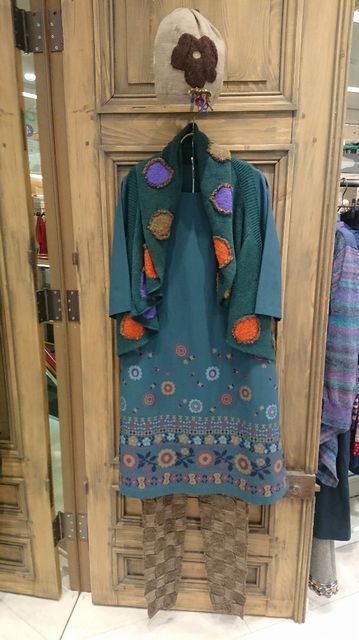あるカーディガンと、きれいな配色のストールでアクセントをつけています。(右)