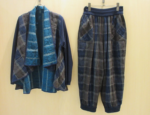 チェックのカーディガンとパンツは、ガーゼのように2重になっている