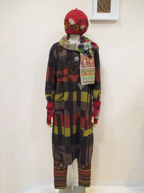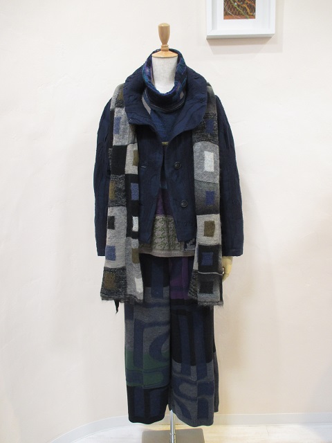 鮮やかな色のウールを表と裏で組み合わせ、幾何学模様のリンクス柄を入れる事により