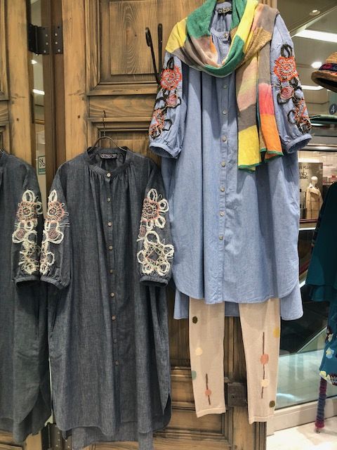 袖の刺繍が可愛いダンガリーワンピースはカラフルなショールをアクセントに☆